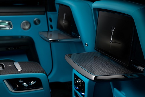 If specified in the client’s commission, the Technical Fibre ‘Waterfall’ section of the individual rear seats receives the Black Badge family motif: the mathematical symbol that represents potential infinity known as a Lemniscate. Rendered in aerospace-grade aluminium on the lid of Black Badge Ghost’s Champagne cooler, it is applied between the third and fourth layer of a total of six layers of subtly tinted lacquer, creating the illusion that the symbol is floating above the Technical Fibre veneer.